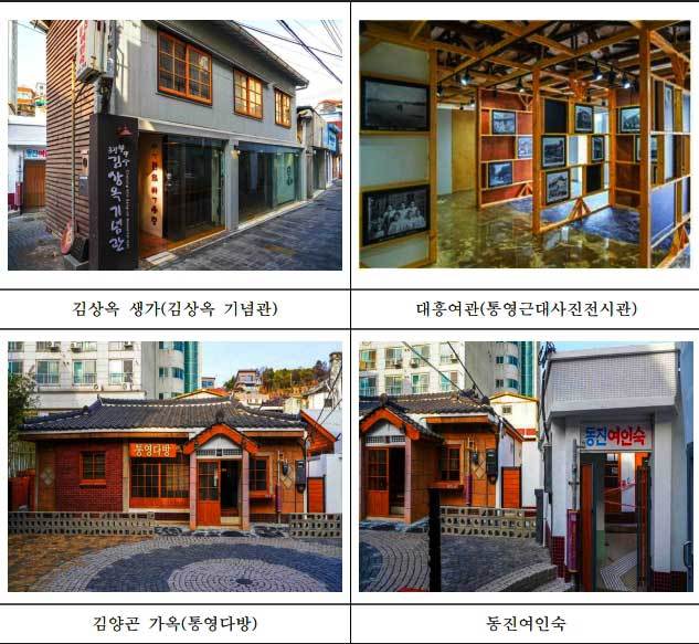 이번 사업을 통해 국가등록문화유산인 「김상옥 생가」와 「구 대흥여관」은 각각 통영 출신의 예술가인 김상옥 시인의 삶과 작품들을 확인할 수 있는 ‘김상옥 기념관’과 통영의 근대 도시경관을 살펴볼 수 있는 ‘통영시 근대 사진 전시관’으로 재탄생했으며, 등록문화자원*인 동진여인숙과 김양곤 가옥은 체험형 공간과 카페로 탈바꿈했다. 지역민과 방문객들이 머물며 휴식을 취할 수 있도록 소규모의 열린 쉼터(오픈스페이스)도 함께 마련되었다.