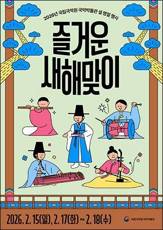 설 명절을 맞이해 진행되는 국악 스탬프 임무 잔치다. <즐거운 새해맞이>는 국악박물관 전시실 곳곳에 숨겨진 소인(스탬프)를 찍어 나만의 엽서를 완성할 수 있는 체험이다. 임무를 모두 완수한 참가자에게는 선착순 200명 한정으로 '국악 DIY 모빌'을 준다. 설 명절 국악박물관 행사는 2월 15일(일), 2월 17일(화)~18일(수) 동안 진행된다. 2월 16일(월) 정기휴관.