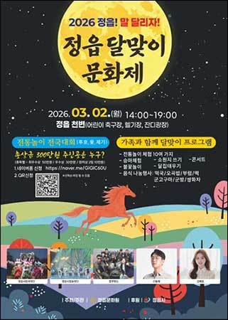 [우리문화신문=이한영 기자] 정읍문화원이 2026년 정월대보름을 맞아 오는 3월 2일 정읍 천변 어린이 축구장 일원에서 2026 정읍 달맞이 문화제 '정읍! 말 달리자!'를 연다. 이번 행사는 사라져가는 세시풍속을 계승하고 시민의 안녕을 기원하기 위해 마련됐다. 이번 문화제는 정월대보름의 전통을 잇고 시민이 함께 어우러지는 참여형 전통문화 축제로 기획됐다. 행사는 전통놀이 전국대회를 비롯해 안녕기원제, 달집태우기 등 남녀노소 누구나 즐길 수 있는 다양한 프로그램으로 채워진다.