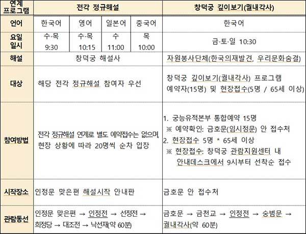이번 프로그램은 요일별로 운영 방식이 다르다. 매주 수ㆍ목요일에는 기존 정규해설과 연계하여 한국어와 외국어로 진행되며, 금ㆍ토ㆍ일요일에는 궁궐 내 관원들의 업무 공간이었던 궐내각사를 탐방하는 ‘창덕궁 깊이보기(궐내각사)’ 심화해설과 연계하여 한국어로 운영된다.
