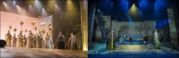 국립창극단 <보허자>는 시처럼 쓰인 아름다운 극본과 강렬한 음악뿐만 아니라, 한 폭의 수묵화 같은 무대 미학으로도 호평받았다. 무대디자이너 이태섭은 ‘꿈의 폐허’를 열쇠말로 비극이 휩쓸고 간 자리를 시각화했다. 거친 질감의 합판으로 재현한 무너진 기둥과 난간은 비극의 잔해를 상징하며, 무대 중앙의 거대한 언덕은 인물들이 걸어온 고단한 생의 여정을 형상화한다. 특히, 후반부 무대 위로 흩날리는 복숭아 꽃잎과 함께 펼쳐지는 ‘몽유도원도’ 장면은 몽환적인 아름다움을 선사하며 작품의 백미로 꼽힌다.