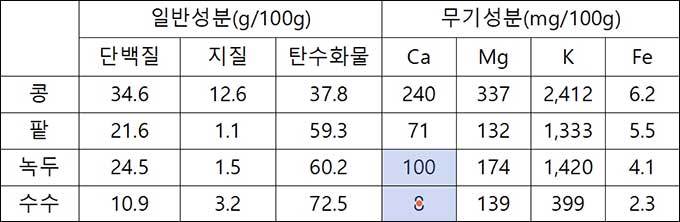 수수는 항산화 성분이 풍부해 콜레스테롤 흡수를 억제해 비만, 당뇨 등 생활습관병 예방에 좋다. 특히 찰수수 ‘고은찰’은 폴리페놀, 플라보노이드 등 항산화 성분 함량이 높은 편이다. 녹두는 껍질에 플라보노이드, 비텍신 등 항산화 및 해독 성분이 풍부한 작물이다. 비텍신은 활성산소를 제거해 노화를 억제하고 염증 완화에 탁월하다. 참깨 ‘슬기’는 항산화, 인지기능 개선에 효과가 있는 리그난 함량*이 풍부하다. 들깨 ‘새찬’은 동맥경화, 고혈압 예방에 효과 있는 리놀렌산 함량**이 풍부하다.