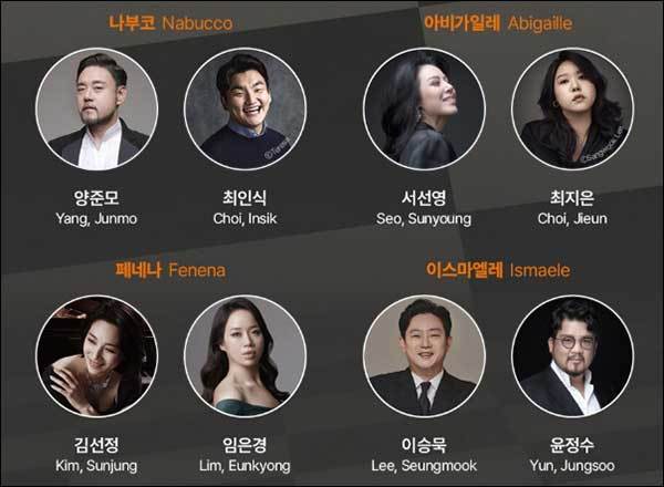 출연진에는 나부코 역에 양준모ㆍ최인식, 아비가일레 역에 서선영ㆍ최지은, 페네나 역에 김선정ㆍ임은경, 이스마엘레 역에 이승묵ㆍ윤정수, 자카리아 역에 전승현ㆍ임채준, 안나 역에 김동연ㆍ신혜리, 아브달로 역에 김성진ㆍ위정민, 바알 대제사장 역에 최공석ㆍ한혜열이 무대에 오른다.