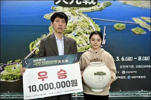 [우리문화신문=이나미 기자] 스미레 4단이 2026 양구군 국토정중앙배 천원전에서 우승을 차지하며 한국에서 두 번째 우승컵을 들어 올렸다. 8일 강원도 양구군 양구종합 스포츠타운에서 열린 결승전에서 스미레 4단은 정준우 3단을 상대로 184수 만에 백 불계승을 거두며 정상에 올랐다.
