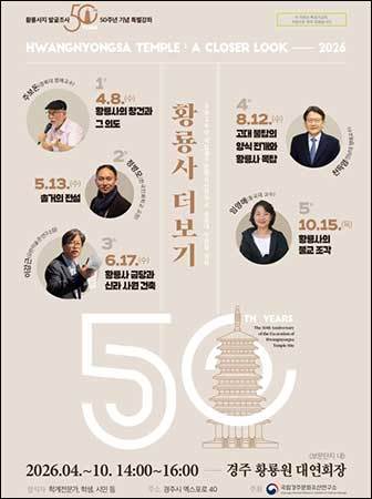 [우리문화신문=한성훈 기자] 국가유산청 국립문화유산연구원 국립경주문화유산연구소(소장 임승경, 아래 ‘경주연구소’)는 황룡사터 발굴조사 50돌을 맞아 2026년 숭문대 인문학 강좌 「황룡사 더보기」를 오는 4월 8일부터 10월 15일까지 경주 보문단지 내 황룡원에서 연다.