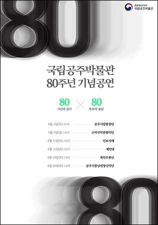 최장열 국립공주박물관장은 “우리 박물관과 공주시 예술가는 오랜 세월 지역 문화를 보존하고 발전시켜 온 동행자”라며, “개관 80돌의 상징성을 담아 80인의 예술인을 초청한 만큼, 4월 매주 펼쳐지는 수준 높은 공연이 관람객들에게 감사의 마음으로 전해지길 바란다”라고 말했다.