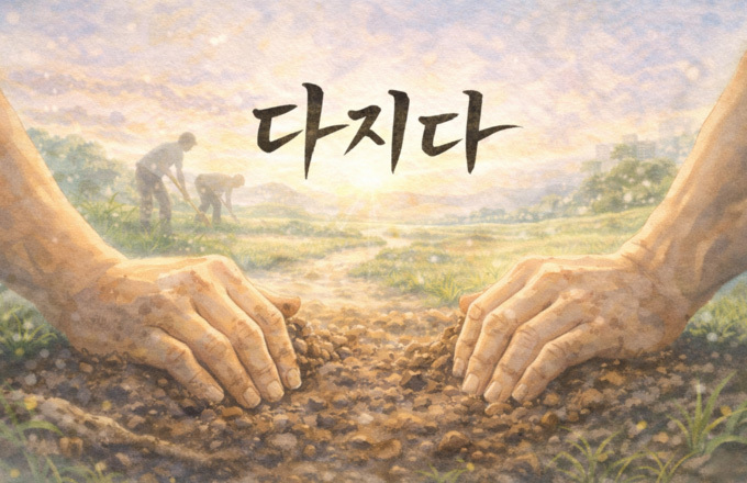 나라 사이의 일이든 사람 사이의 일이든, 끝까지 가는 힘은 곱고 아름다운 말잔치가 아니라 보이지 않는 곳에서 얼마나 단단하게 밑바탕을 만들었느냐에 달려 있습니다. 이른 아침, 일터로 나가는 사람들이 신발 끈을 고쳐 매며 오늘 하루를 잘 살아보겠노라 속으로 되뇌는 그 다짐 속에 우리 삶의 참 무게가 담겨 있습니다. 이런 자리느낌(분위기) 속에서 우리 마음의 뿌리를 튼튼하게 내려줄 토박이말 '다지다'를 꺼내어 봅니다.