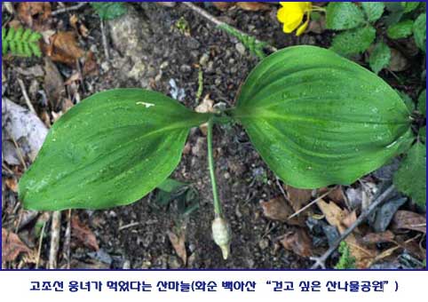 삼국유사에 있는 이야기입니다. 그런데 당시 웅녀가 먹었다는 마늘과 지금 우리가 먹는 마늘이 다르다고 합니다. 명나라 이시진이 엮은 《본초강목》에 “산에서 나는 마늘을 산산(山蒜), 들에서 나는 것을 야산(野蒜), 재배한 것을 산(蒜)”이라 하였습니다. 후에 서역에서 톨이 굵은 대산(大蒜)이 들어오게 되어 전부터 있었던 산을 소산이라 하였다는 기록이 보이지요. 또 허준의 《동의보감》에서는 “대산을 마늘, 소산을 족지, 야산을 달랑괴”로 구분하였습니다. 곧 웅녀가 먹은 것은 보통 마늘이 아니라 “산마늘”인 것이지요.