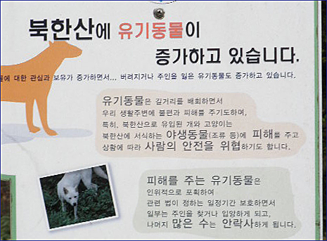 ▲ 북한산 들머리에 세워진 유기동물 안내 팻말