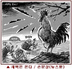 을유년 닭의 해가 밝았습니다. 닭은 갓밝이에 새벽을 알리는 힘찬 닭울음을 냅니다. 이 닭울음은 수탉이 다른 수탉 앞에서 자신의 힘을 과시하기 위한 것이라 합니다. 또 닭이 새벽을 알리면 귀신이 물러간다고도 하며, 설날 벽 위에 닭의 그림을 붙여 액이 물러나기를 빌었습니다. 우리 조상들은 닭을 액과 귀신을 쫒는 동물로 보았습니다. 지난해는 경기악화로 많은 서민들은 고통의 연속이었으며, 세밑에 동남아시아에 큰 해일이 일어 수많은 사람들이 죽었습니다. 하지만 닭의 해가 밝아온 지금 닭처럼 힘차게 기지개를 켜면 액이 물러가고, 환한 한해를 맞이한다는 믿음을 가져봅시다. 또 닭이 1년에 250개까지 알을 낳을 수 있는 것처럼 서민들의 재화가 늘어나 끼니를 거르고, 아파도 치료를 받지 못하는 사람이 없었으면 합니다. 이글거리며 힘차게 떠 오른 해는 모두에게 희망입니다.