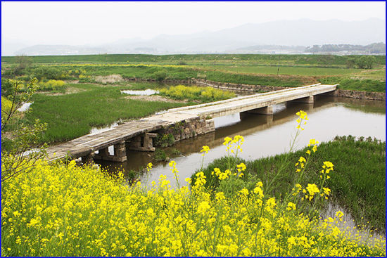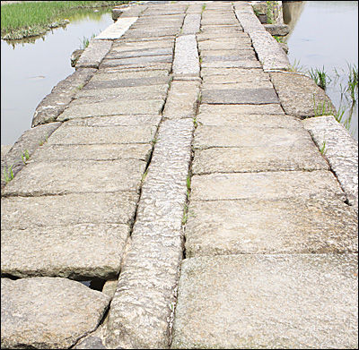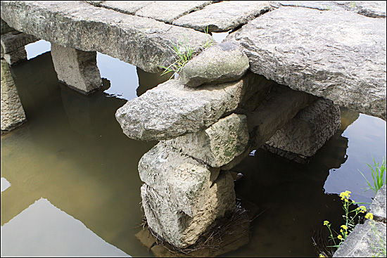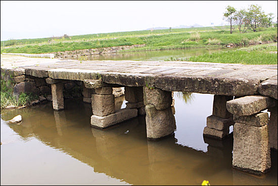 다리 모양은 좀 투박해 보이지만 멋 부리지 않은 자연 그대로의 느낌을 줍니다. 자연을 닮은 화강암 돌 4~5개를 포개어 교각을 만들고 네모난 돌을 한두 개 받쳐 굄돌로 삼았지요. 그 위에 다시 시렁돌을 올렸는데 이 돌은 노면보다 양쪽으로 50cm가량 튀어나와 있어서 멀리서 보면 마치 다리의 날개처럼 보입니다. 전체 길이 20m, 너비 3m, 높이 2.1m인 이 다리는 옛날엔 수수, 조를 널어도 한 알도 빠지지 않을 정도로 상판에 틈이 없었다고 하는데 700여년이 지난 세월 때문인지 다리 상판 위에 서면 약간 틈새가 느껴집니다.