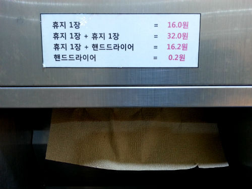 백화점이나 사무실 화장실에 가면 벽면에 위와 같이 휴지를 준비해 놓은 곳이 많다. 며칠 전 서울 시내 어느 화장실에 가니 이렇게 적혀 있다. 휴지 1장에 16원 , 핸드드라이어와 휴지 한장에 16.2원....돈으로 환산해 놓으면 사람들이 얼른 절약을 할 것이라는 생각인 모양인데 어째 씁쓸하다.