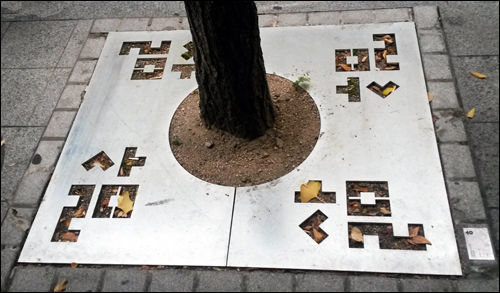 <한글숨바꼭질> 탐방은 먼저 세종문화회관 옆의 문자마당에서 시작되었다. 곳곳에 숨어있는 조형물들은 있는 듯 없는 듯하면서도 구석구석 빛을 발하고 있었다. 공원 바닥에 붙어 있기도 하고, 벽에 붙어 있는가 하면, 지하철 승강기 맨 꼭대기에 우뚝 솟은 것도 있다. 그런가 하면 풀숲에 수줍은 듯 고개를 내미는 것도 있고, 건물 옥상 바로 아래서 내려다보기도 하며, 꼬마 가로등이 되어 주변을 아름답게 비춰주기도 했다.