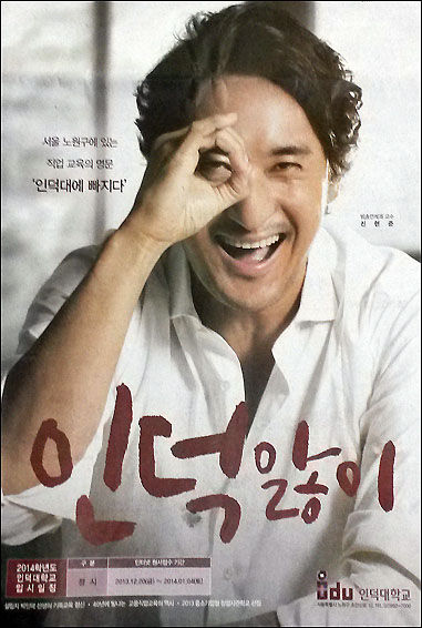 그런데 인덕대학교는 아주 신선하게 우리말로만 된 신문광고를 냈습니다. 영화배우 신현준(인덕대 방송연예과 교수)를 앞세운 광고는 맨 위 누리집 주소 말고는 영어를 전혀 쓰지 았았지요. 그뿐만 아니라 광고의 제목까지도 <인덕앓이>라 함은 물론 "인덕대에 빠지다" 따위의 말을 써서 순우리말 광고의 모범을 보입니다. 인덕 관계자들의 우리말 사랑이 돋보이는 순간이지요.