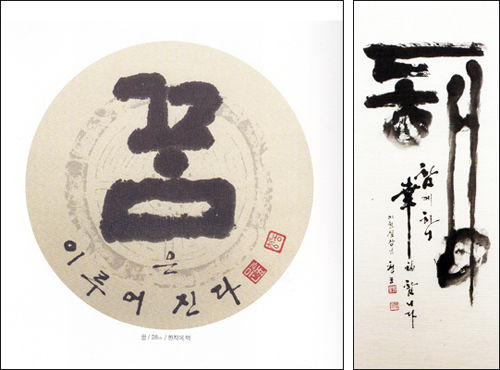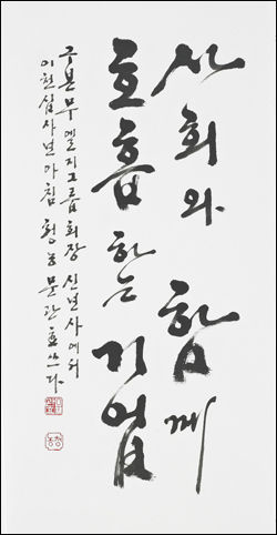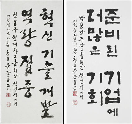 이 “사회와 함께 호흡하는 기업”이라는 구 회장의 경영 화두가 한글 서예가 문관효 씨(60·한국서도협회 사무총장)의 독특하고 힘찬 청농체(한글의 회화성을 강조한 서체)로 다시 태어났다. 청농 문관효 작가는 지난해 7월 우리나라 서예계에서 가장 권위 있는 상으로 평가받는 원곡서예문화상(제35회)을 받았는데 심사위원들이 8M에 이르는 훈민정음 언해본 작품을 만장일치로 꼽았다. 이번 작품들도 화선지에 먹물을 듬뿍 찍어 쉬지 않고 청농체를 단숨에 써 내려가 진한 묵향이 진동한다.