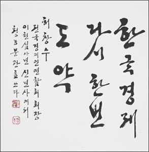 문 작가는 “재계 총수들이 신년사를 통해 제시한 경영 화두는 위기와 혁신인 듯하다. 기술과 조직 혁신을 강조해 좀 더 실천적으로 접근했다는 점을 글씨에 녹여냈다. 특히 구 회장의 ‘사회와 함께 호흡하는 기업’ 우리 문화와 맥이 닿은 듯한 화두여서 더욱 정성을 들였다 ”고 말했다. 지금 한겨울 대한민국엔 경제한파도 몰아치고 있다. 이때 문 작가의 힘차고 따뜻한 붓글씨가 따뜻한 봄바람으로 바꿔내는 마술을 부릴 것이란 기대를 해본다.
