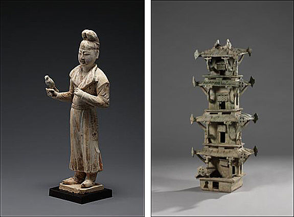 ▲ 인물상(人物像), 당(唐) 8세기 초, 높이 37.7㎝, 2013년 구입(왼쪽) / 누각 모형(樓閣模型), 후한(後漢) 1~2세기, 높이 130.0cm, 2013년 구입
