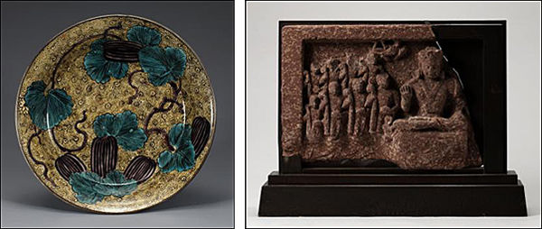 ▲ 참외무늬 낮은 대접(色絵瓜文平鉢), 에도(江戸), 1640~1660년경, 높이 7.5㎝ 입지름 32.0㎝, 2013년 구입(왼쪽) / 보살과 숭배자, 인도 마투라 3~4세기, 높이 47.5㎝, 2013년 구입