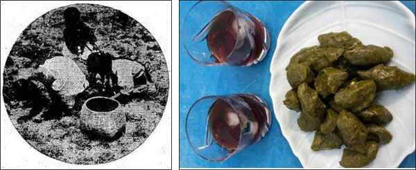 | ▲ 따뜻한 볕 아래 쑥을 캐는 아이들(왼쪽, 동아일보 1933.4.2), 쑥 개떡 | ||
