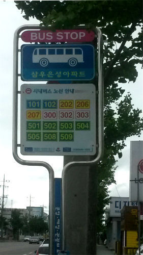 강릉 시내 외곽지역 한 버스정류장 표시, 단언컨대 이곳에서도 서양인이 시내버스를 기다일 일이 거의 없는 곳임. 자라나는 어린학생들을 봐서라도 우리말을 먼저 쓰고 그 밑에 영어를 달아주는 습관을 들였으면 좋으련만........