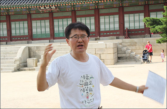 그 “한글가온길” 답사는 김슬옹 교수의 안내로 어제(7월 30일) 오후 4시에 시작되었다. 먼저 국립고궁박물관 앞에서 이 답사의 의의를 간단하게 설명하고 수정전(修政殿)으로 자리를 옮긴다. 세종 당시 집현전이 있었던 수정전 앞에 가자 김슬옹 교수는 퀴즈를 내 흥미를 돋우는 말로 답사의 서막을 내딛는다.