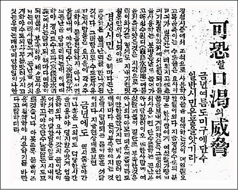 | ▲ 동아일보 1921년 5월5일 치, "가공할 구갈의 위협" 기사 | ||