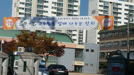 ▲ 경남 진주 배영초등학교 교문에 붙은 펼침막에는 이날 찾아오는 분들을 맞이하는 문구가 남다르다