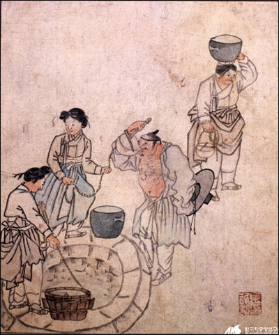 | ▲ 김홍도의 "우물가", 사내가 배꼽을 내놓고 있다. | ||