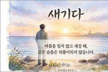 [우리문화신문=이창수 기자] 반갑습니다. 우리말의 결을 살려 마음을 보듬는 '토박이말 결지기'입니다. 그림 속, 차가운 새벽 물안개가 자욱한 바닷가에 홀로 선 남자의 굽은 등을 가만히 바라봅니다. 수평선 너머로 이제 막 떠오르는 해는 수줍은 듯 온 세상을 귤색 빛으로 물들이고 있네요. 부드럽게 불어오는 바람이 그의 머리칼을 스치고, 모래톱 위 작은 노란 리본과 종이배는 그 바람에 실려온 듯 낮게 웅크리고 있습니다. 그의 눈길은 저 먼바다, 어쩌면 그날의 기억이 멈춘 곳을 향해 있을지도 모르겠습니다. 열두 번의 봄이 다시 찾아왔습니다. 해마다 돌아오는 이 계절의 바람은 누군가에게는 따스한 꽃내음이지만, 그에게, 그리고 또 다른 누군가에게는 여전히 시리고 아픈 기억의 조각들을 실어 나르는 바람입니다. 오늘은 그 아픈 시간을 건너온 우리 모두의 마음을, 그림 속 따스한 아침 햇살처럼 가만히 보듬어보려 합니다. 마음속 깊은 곳에 뚜렷이 '새기다' 열두 해가 지났지만, 여전히 가슴 한구석이 아릿해지는 것은 우리가 그날의 약속을 잊지 않았기 때문일 것입니다. 이번 기억식에서 전해진 "국가가 책임을 다하겠다"는 다짐과 희생자들을 향한 추모 소식은, 그림 속 떠오르는 해처