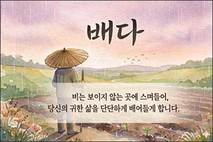 [우리문화신문=이창수 기자] 그림 속 풍경이 참으로 평온하고도 뭉클합니다. 보랏빛과 귤빛이 은은하게 섞인 아침 하늘 아래, 보슬보슬 내리는 마지막 봄비가 온 대지를 촉촉이 적시고 있습니다. 우산을 쓰고 지팡이를 짚은 채 밭둑에 선 저 뒷모습을 가만히 바라봅니다. 등 위로 떨어지는 빗방울은 어쩌면 고단한 하루의 무게일지도, 혹은 내일의 풍요를 기다리는 설렘일지도 모르겠습니다. 언덕 너머로날아가는 새들과 이제 막 고개를 내민 어린 싹들이 비를 맞으며 숨을 고르는 이 시간, 우리도 잠시 그 풍경 속에 머물며 마음을 씻어내 봅니다. 깊이 스며들어 우리 것이 되는 '배다' 비록 비가 내리지는 않지만 오늘은 봄의 마지막 절기이자, 모든 곡식이 잠에서 깨어난다는 '곡우'입니다. 저희 토박이말바라기에서는 이 아름다운 날을 '낟알비'라고 다듬어 부르고 있어요. '껍질을 벗기지 아니한 곡식의 알'을 가리키는 '낟알'에 '비'를 더해 만든 만든 말입니다. 이름만 들어도 포슬포슬 내리는 비가 논밭의 낟알들을 포근히 감싸 안는 풍경이 그려지지 않는가요? 오늘 우리가 함께 나눌 토박이말은 바로 '배다'입니다. 《표준국어대사전》에서는 '배다'를 단순히 물기가 스며들거나 스며 나오는 것