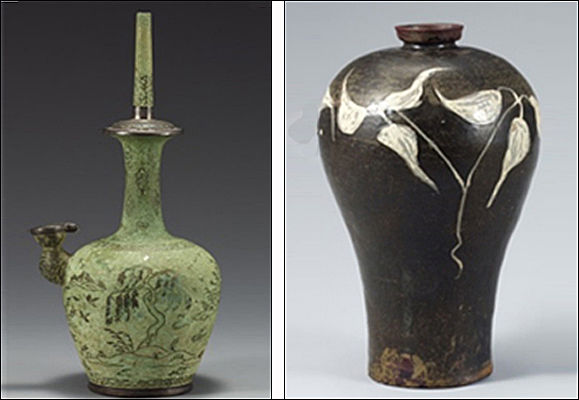 | ▲ 물가풍경무늬 정병[靑銅銀入絲蒲柳水禽文淨甁], 고려 12세기, 높이37.5㎝,입지름 1.1㎝, 국보92호(왼쪽) / 인삼잎무늬 매병[靑磁鐵彩堆花蔘葉文梅甁], 고려 12세기, 높이 27.6 ㎝, 입지름 4.9 ㎝, 국보340호 | ||