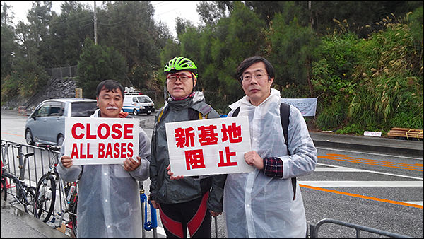오늘 갈 곳은 후텐마 기지가 이전하기로 되어있는 헤노꼬와 오키나와 전투로 사망한 자들을 기리는 평화기념공원이다. 잠시 가니 왼쪽으로 가는 329번 도로를 알려주는 이정표가 나와 동쪽으로 넘어갔다. 산마루에 오르니 미군기지(Camp Schwab)가 나오고 그 앞에서 시민들이 시위하고 있었다.