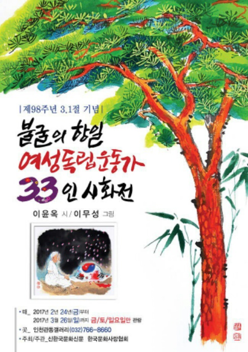이번 시화전은 노동자 민족차별에 항거한 “강주룡”, 비밀여성단체 송죽회로 투쟁한 “김경희” , 무등산 소녀의 나라사랑 “김금연”, 상해인성학교서 독립정신 펼친 “김윤경” 등 이무성 화백이 새로 그린 33점의 작품으로 전시되며 <불굴의 항일여성독립운동가 33인 시화전>이라는 주제로 2월 24일(금)부터 3월 26일(일)까지 인천관동갤러리에서 열린다.