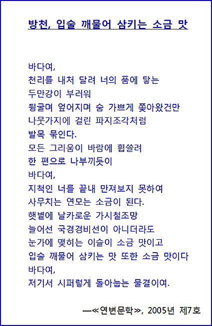 < 해 설 > 방천의 사전적 의미는 둑을 쌓거나 나무를 심어 냇물이 넘쳐 들어오는 것을 막는 것을 말한다. 그 둑을 방천이라고도 한다. 하지만 시인은 각주를 달아 “두만강이 동해바다로 흘러드는 지역. 중, 조, 러 3국 국경이 인접해 있다. 중국 쪽으로는 해변에 닿을 수 없다.”고 설명하고 있어 사전적인 의미와는 많이 다름을 알 수 있다. 여기서 ‘방천’은 훈춘 지역의 한 지명으로, 3국의 국경이 인접해 있는 한 마을의 이름이다. 국경 초소가 있는 곳이기도 하지만 이 지역의 유명한 관광명소로 많은 유람객들이 찾고 있다.