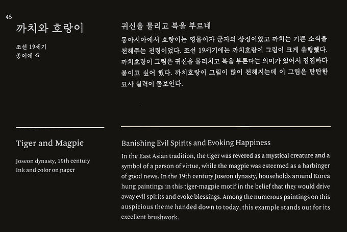 위 까치호랑이 그림은 고 이건희 삼성그릅 회장이 기증한 많은 작품들 가운데 민화로 가장 빼어난 작품으로 현재 국립중앙박물관 특별실에 전시중이다.