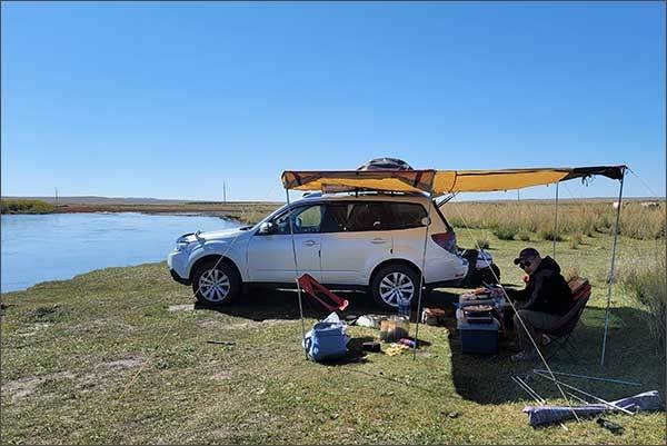 헤를렌강이 굽이굽이 사행천을 이루며 동쪽으로 흘러간다. 강가에서 압력밥솥으로 밥을 해 먹고 칭기즈시까지 오니 18시 정도 됐다. 2시간을 더 달려 19시 30분 바람이 덜 부는 산비탈에 텐트를 치고 야영하였다.