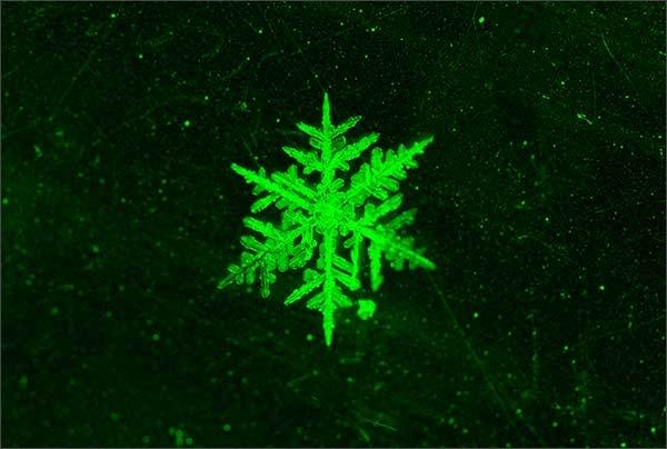 눈 결정 모양. 지난 1월 26일 오전 날씨는 영하 5도에 눈발이 날리고 있었다. 7시50분에 아파트 베란다 창문을 열고 투명 아크릴판에 눈을 받아 그자리에서 촬영하였다. 눈결정은 습도와 온도가 잘 맞아야 잘 찍히는데 그날의 조건은 상당히 좋았나보다. 색깔은 예쁘게 채색을 해본 것이다.