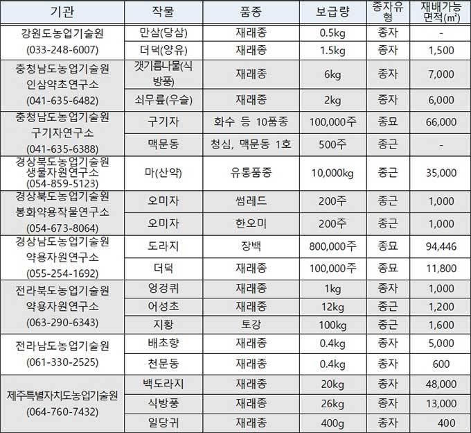 * 강원도농업기술원 인삼약초연구소: 만삼(당삼), 더덕(양유) * 충청북도농업기술원: 배초향(곽향), 잔대, 하수오 * 충청남도농업기술원: 갯기름나물(식방풍), 쇠무릎(우슬), 구기자, 맥문동 * 전라북도농업기술원 약용자원연구소: 엉겅퀴, 어성초, 지황 * 전라남도농업기술원: 배초향(곽향), 천문동 * 경상북도농업기술원: 마(산약), 오미자 * 경상남도농업기술원 약용자원연구소: 도라지, 더덕 * 제주특별자치도농업기술원 약용작물종자보급센터: 도라지, 식방풍, 일당귀 * 제천시농업기술센터 약용작물종자보급센터: 백수오, 잔대, 작약 * 한국농업기술진흥원: 단삼 * 한국한의약진흥원: 반하 |