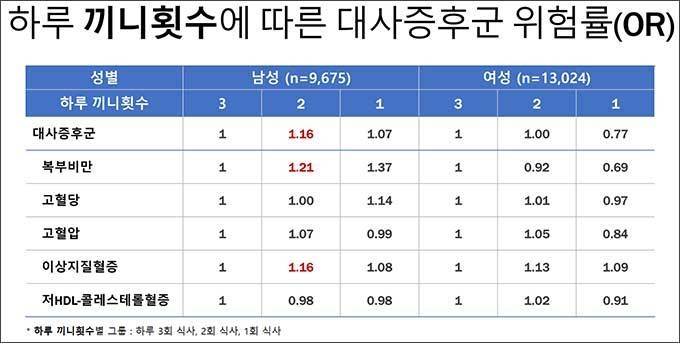 분석 결과, 하루 세 끼를 먹는 남성보다 두 끼를 먹는 남성에서 대사증후군 위험이 1.16배 증가했다. 대사증후군 주요 인자 가운데 하나인 복부비만은 1.21배, 이상지질혈증 위험은 1.16배 높았다.