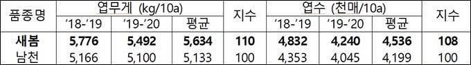 * ‘남천’보다 잎 무게 10%, 수량 8% 많음.