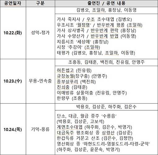 첫날인 10월 22일(화)은 정가(正歌) 분야의 대표적인 가객인 고 이석재 문하의 홍창남 정악단 단원, 고 김월하 문하의 조일하 정악단 단원, 그리고 현재 국가무형유산 종묘제례악(악장) 예능전승교육사이자 국립국악원 악장을 역임한 김병오와 그 제자인 이동영 정악단 단원의 무대로 꾸며진다. 가곡, 가사, 시조, 시창 등 정가의 진수를 맛볼 수 있는 다채로운 무대가 선보여질 예정이다.