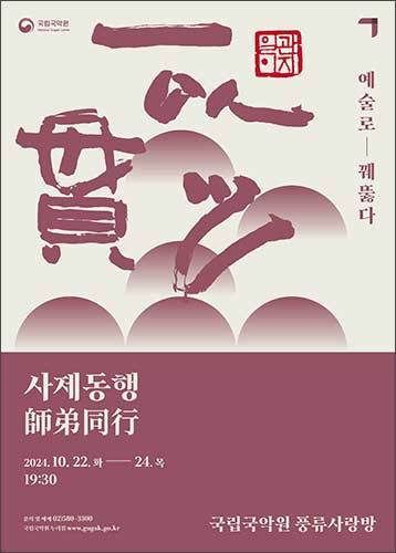 국립국악원 기획공연 ‘일이관지-사제동행’은 10월 22일(화)부터 10월 24일(목)까지 저녁 7시 30분 국립국악원 풍류사랑방에서 선보이며, 국립국악원 누리집(www.gugak.go.kr) 또는 전화(02-580-3300)로 예매할 수 있다. 전석 3만 원