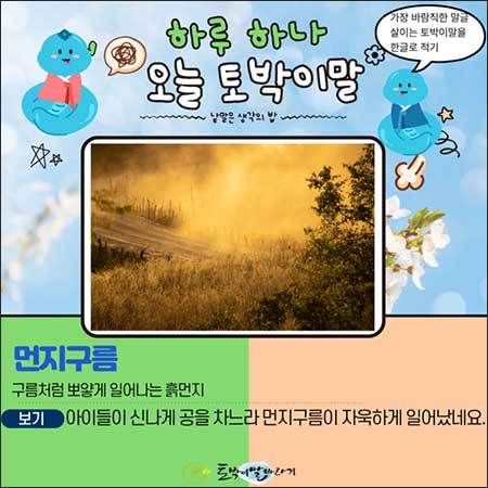 오늘 우리가 함께 나눌 토박이말은 땅에서 피어오르는 구름이라고 할 수 있는 '먼지구름'입니다. '먼지구름'은 그 이름 그대로 '먼지'와 '구름'이 만난 말입니다. 흙먼지가 마치 구름처럼 뭉쳐 떠오르는 모습을 아주 멋들어지게 그려냈지요.