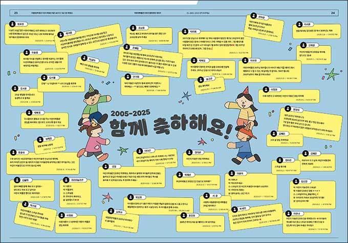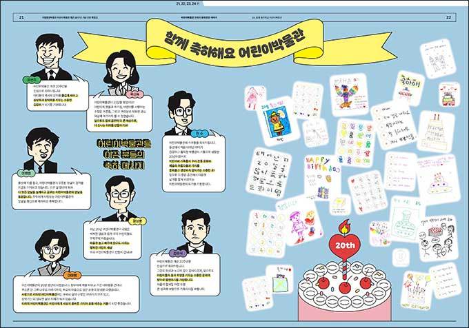 마지막 마당은 어린이박물관의 20년을 함께 축하하고, 다음 세대를 향한 다짐을 전한다. 현장을 지켜온 학예연구사와 어린이 기자단의 이야기 <커튼 뒤의 사람들>, <전통과 취향이 만나는 순간>을 비롯하여 2025년에 개최한 기념전시 <20년의 이야기, 유물과 사람>, <일본미술, 네 가지 시선>, <광복 80주년, 다시 만난 얼굴들>에 대한 소식도 담당 학예연구사가 어린이들에게 친근하게 전했다. 특히 <함께 축하해요, 어린이박물관>은 이 지면의 핵심이다. 어린이들이 직접 쓴 축하편지를 비롯해 많은 사람들이 함께 걸어온 시간을 기념하면서 감사와 응원의 마음을 전한다.
