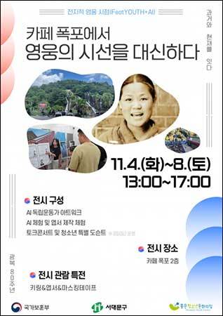 [우리문화신문=이나미 기자] 서울 서대문구 구립홍은청소년문화의집(관장 손제익)은 국가보훈부 보훈테마활동 공모사업의 하나로 추진한 ‘지역사회의 중심에서 영웅의 시선을 대신하다’ 전시회를 오는 11월 4일부터 8일까지 서대문구 소재 카페 폭포에서 연다.