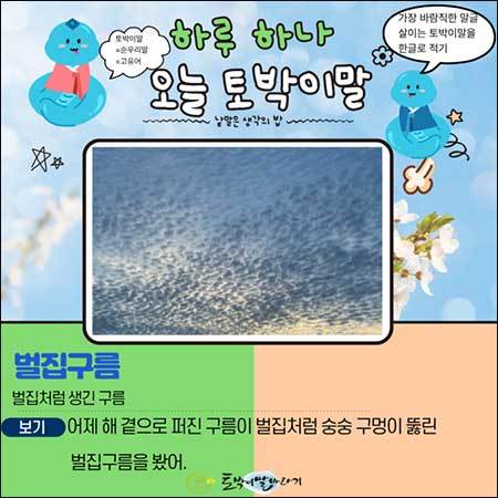 어느 날 문득 하늘을 올려다보았을 때, 얇게 퍼진 구름 사이로 동그란 구멍이 숭숭 뚫려있는 듯한 모습을 본 적 있으신가요? 누군가 하늘에 촘촘한 그물을 쳐 놓은 것 같기도 하고, 꿀벌들이 힘들여 지어 매달아 놓은 '벌집'을 보는 것 같기도 하지요. 오늘 우리가 함께 나눌 토박이말은 바로 이 야릇하면서도 아름다운 구름, '벌집구름'입니다.