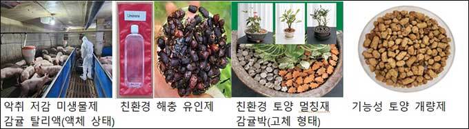 이에 연구진은 산업체, 대학 등과 함께 감귤 부산물 활용 다각화를 목표로 △부산물의 약 30%를 차지하는 침출수(탈리액*)는 악취 저감제와 해충 유인제로, △약 70%를 차지하는 고체 상태의 껍질과 펄프(과육)는 토양 개량제로 활용할 수 있는 기술을 개발했다**.