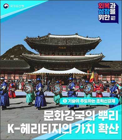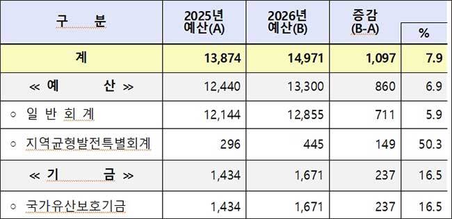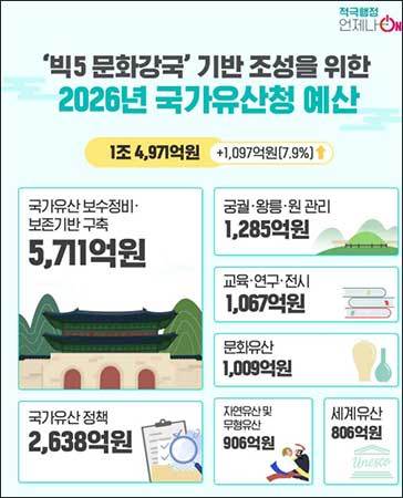 [우리문화신문=한성훈 기자] 국가유산청(청장 허민)은 2026년도 예산(기금 포함) 총지출 규모가 올해(1조 3,874억 원)보다 1,097억 원 늘어난 1조 4,971억 원으로 확정되었다고 밝혔다. 국가유산청은 새 정부의 국민주권시대를 맞이하여 과거 국가유산의 단순한 보존·계승을 넘어 국가유산을 K-컬처의 미래 성장동력으로 발전시키는 한편, 글로벌 문화 경쟁력 강화와 국제적 위상을 제고하는 분야에 예산을 집중하여 투자하였다.