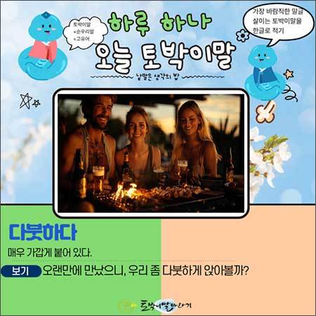 가까운 사람들에게 건네는 말 한마디에도 이 말을 담아보세요. 오랜만에 만난 동무들에게 "우리 좁혀 앉자"라는 흔한 말보다, "오랜만에 만났으니, 우리 좀 다붓하게 앉아볼까?"라고 말해보는 겁니다. 그 말 속에 담긴 살가움에 서먹했던 자리느낌(분위기)가 금세 따스해질 것입니다.