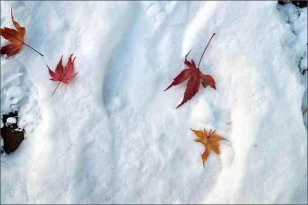 아침이 되어 눈 쌓인 길을 걷다 보니 흰 눈 위에 작은 단풍나무 잎이 조금 마른 채로 살짝 얹혀있다. 갑자기 겨울이 되어 미처 떨어지지 못한 것들이 눈마저 내리니 그 위에 떨어지고 바람에 쓸리는 것이리라. 단풍나무 잎이 마치 새의 발자국 같다. 눈 위에 찍힌 새 발자국이라니 시간의 덧없음을 노래한 바로 그 유명한 '설니홍조(雪泥鴻瓜)'가 이것인가?